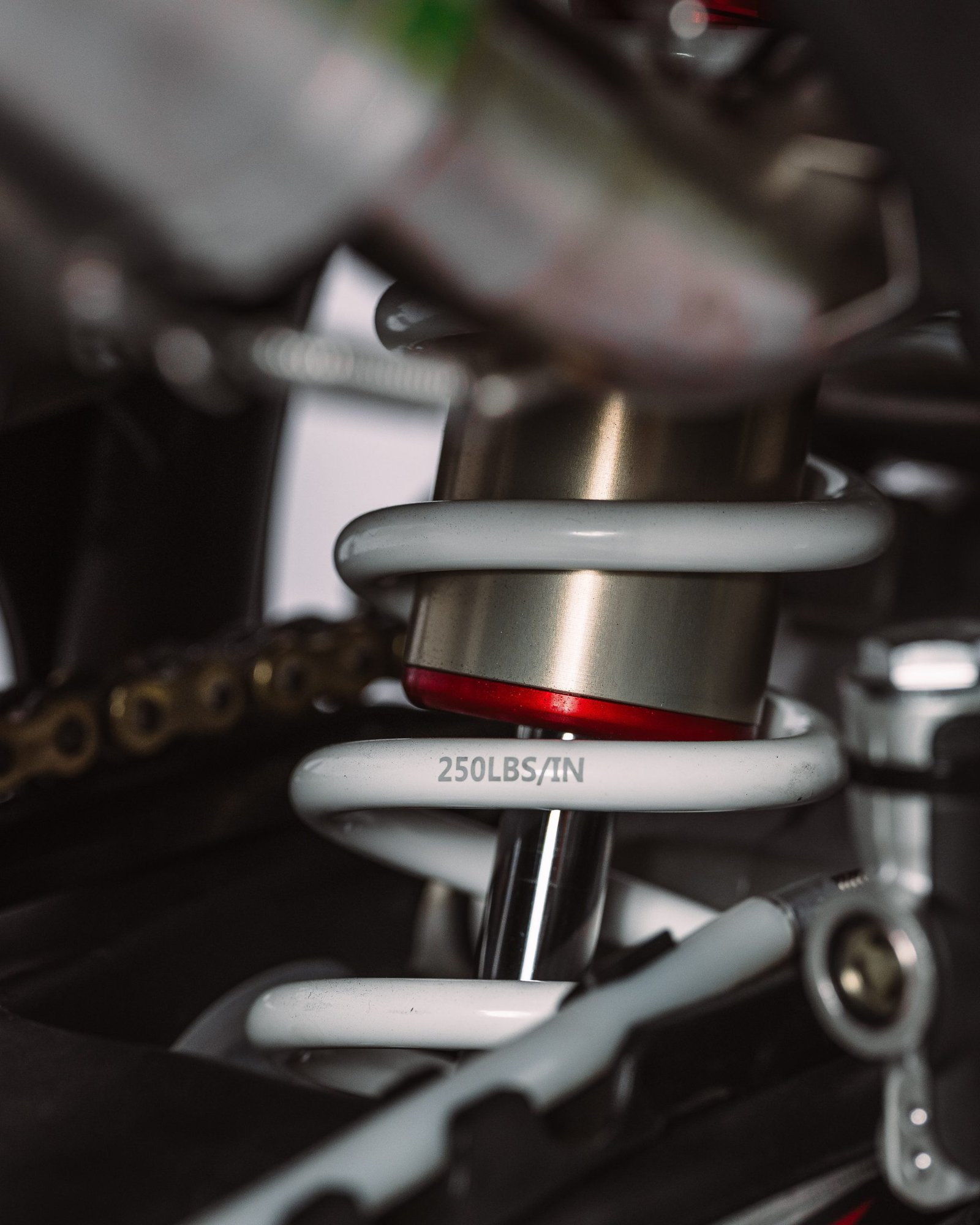 O conjunto de suspensão MP (dianteira 310mm e traseira 300mm) possui regulagem de compressão e retorno por clique. Isso permite que o piloto personalize o acerto para o seu estilo, apoiado por um quadro de Aço Cromo Molibidênio de alta resistência.