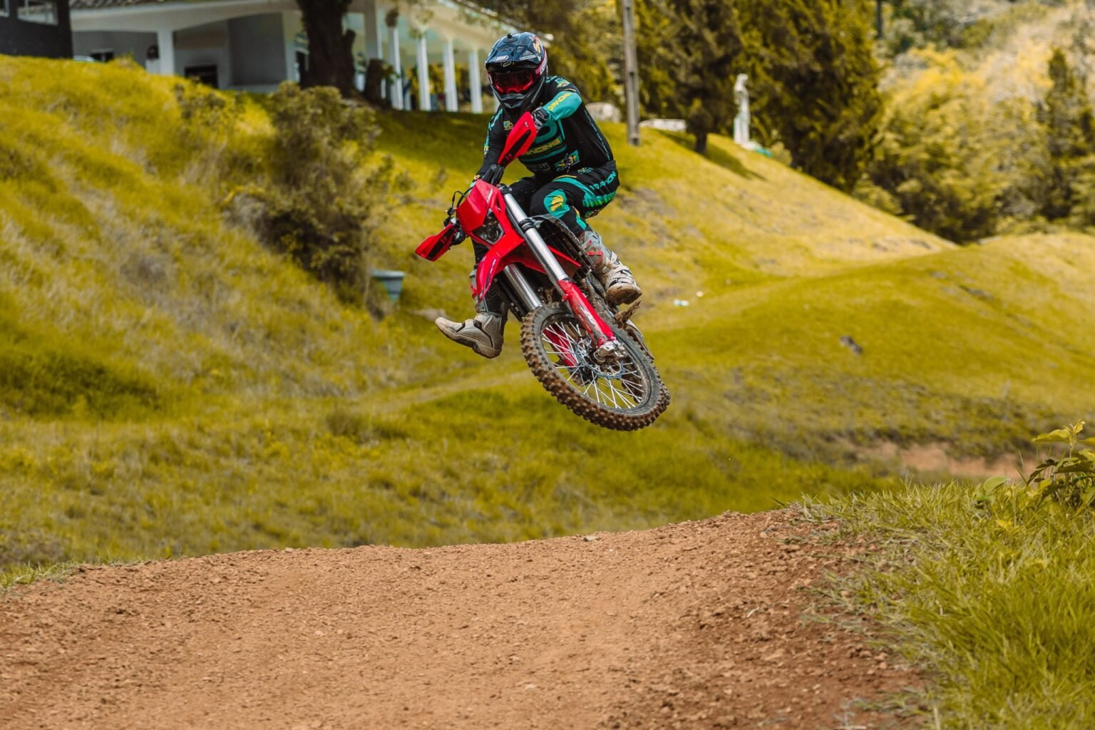 Piloto (roupa verde e preta) em salto lateral com a MXF 250 RXi sobre grama e terra.